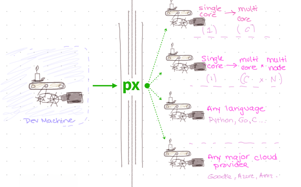 It’s thus better to think about px as a “cloud cluster provision + cloud cluster execution engine” for arbitrary backend code projects. It’s not a database. It’s not a framework. It’s true infrastructure. It is a transparent layer below your code — but above your public cloud hardware.