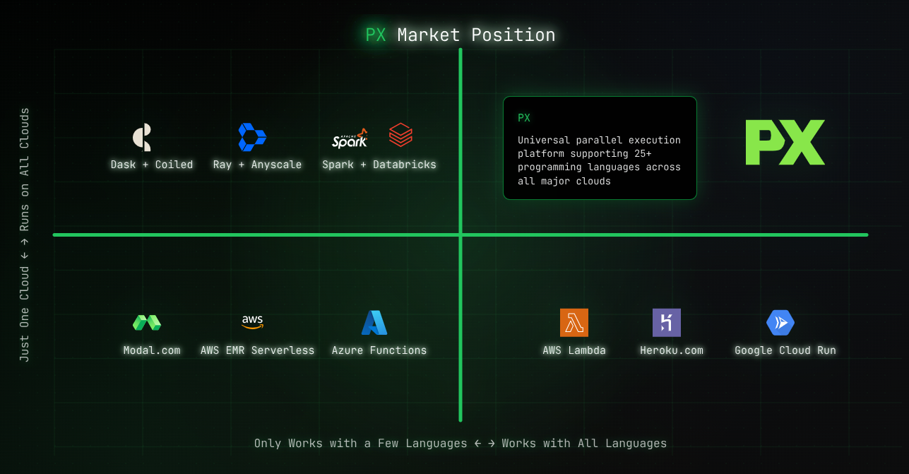 For complex use cases, PX could be used as an alternative to frameworks like Ray/Spark running on a system like Amazon EMR/SageMaker or Google Dataproc/VertexAI. But these architectures are limited to only a few programming languages (usually Python), and were designed for very specific data science and machine learning workloads.
